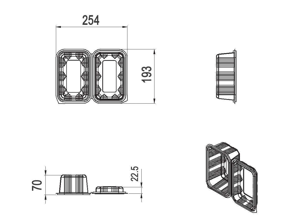 Caserola realizata din PET transparent, dreptunghiulara, capac inalt atasat.